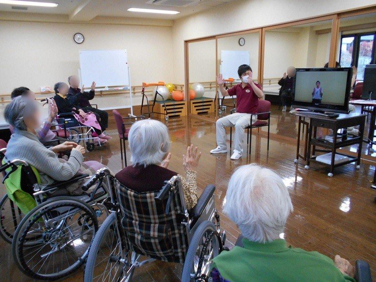 週1回のストレッチ体操は、座ったままで職員と一緒に