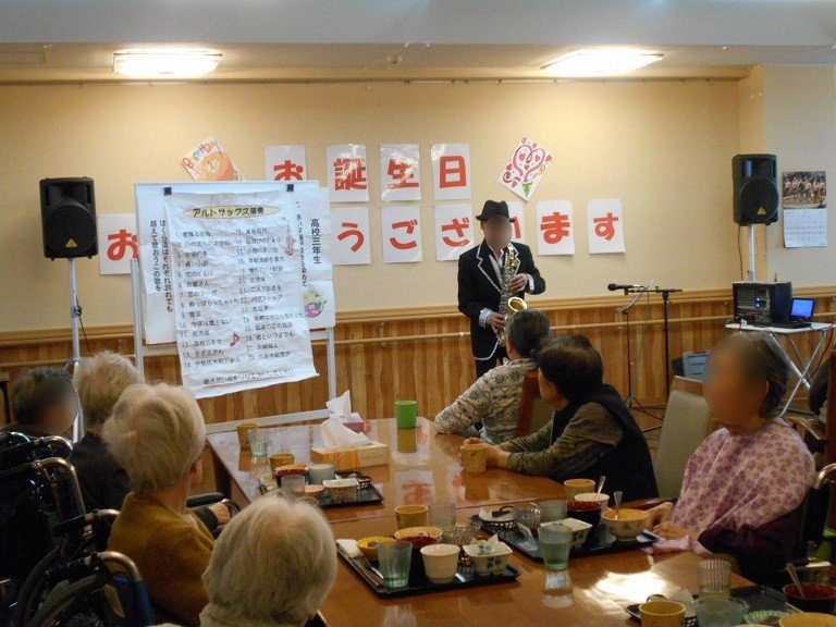 お誕生会でのサックス演奏では、昭和の良き時代を