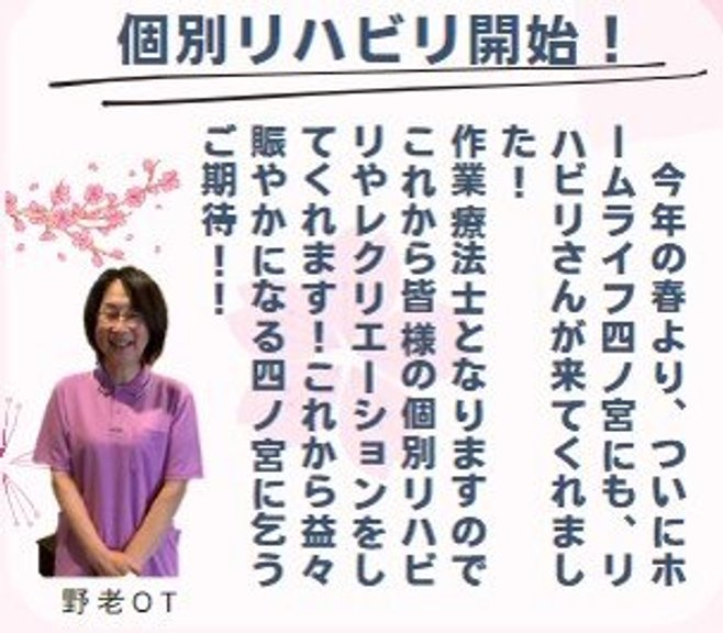 令和7年4月1日より機能訓練士が配置され、お値段に変わりはございませんが個別リハビリを受けて頂く事が可能となっております🌸