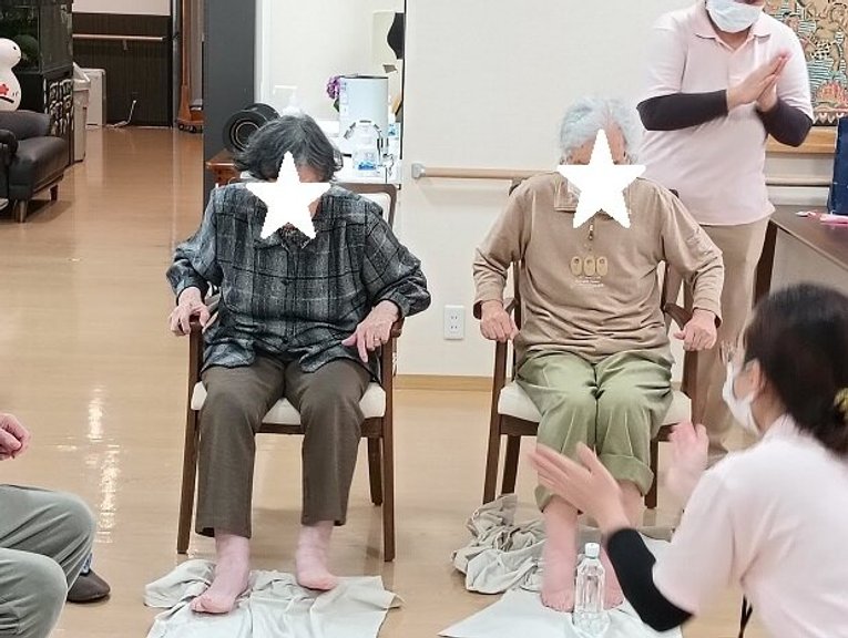 6月16日に行われた「座って徒競走」!各自椅子に座っていただき合図ともに、細い布を足でたぐり寄せる競技。一番初めに長い布をたぐり寄せ終えれたチームの勝利!ただ足を動かすだけではなく少し力が必要になります。自分の一番やりやすい方法を考えプレイされました。「足の指先を動かしいい運動ができました」「これは面白い!」と楽しんでいただけました。是非、フォトギャラリーをご覧下さいませ。