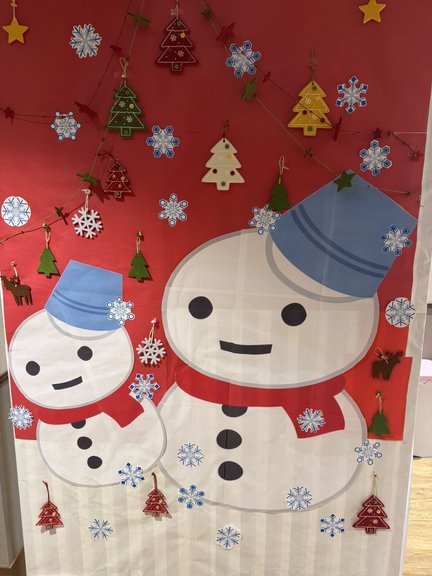 雪だるまや背景等は職員が作りましたが、その他の飾りつけには入居者様にも一部手伝っていただきました。