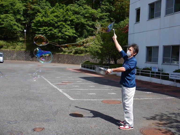 道具をたくさん用意してさまざまな大きさのシャボン玉を作りました。