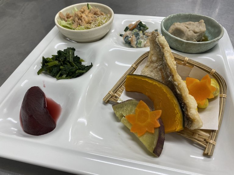 栗・さつま芋・南瓜・銀杏に人参、これを鯛の竜田揚げと共に盛り合わせて、ソバがきも添えてワンプレートでお出ししました。