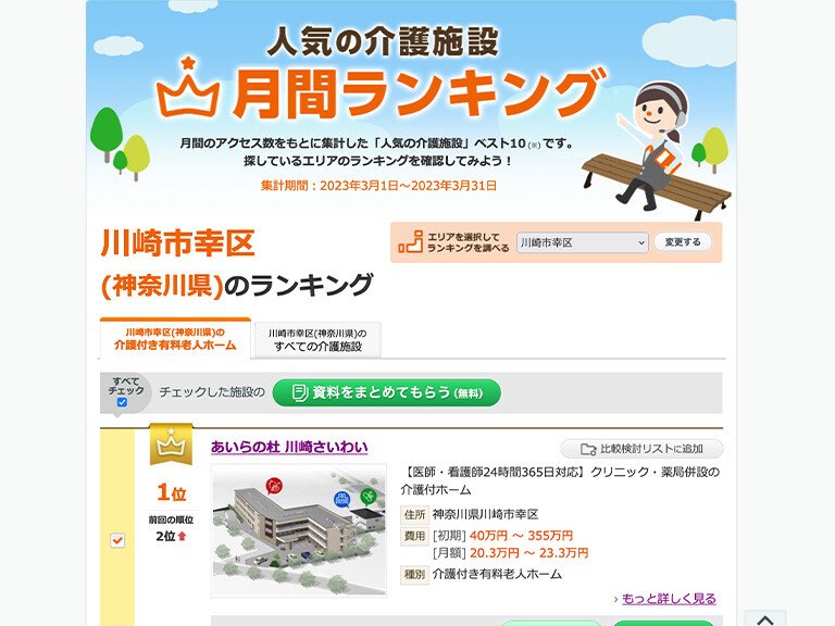川崎市幸区の介護付有料老人ホーム人気ランキングで1位に選出されました(LIFULL介護2023年4月)