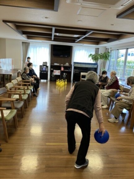 ダイニングの椅子を端に寄せてボーリング大会をいたしました。