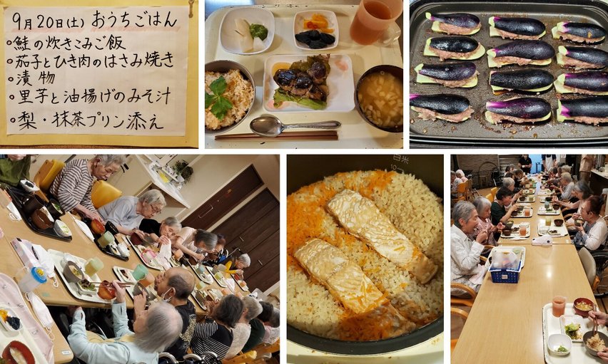 秋鮭を使った炊き込みご飯、茄子の挽肉はさみ焼き、麦味噌を使った里芋の味噌汁などを職員が手料理し召し上がって頂きました。利用者様同士で感想や話しをしながら食事を楽しまれていました。食欲の秋の到来ですね。