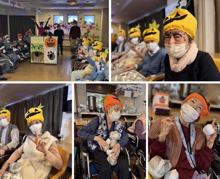 職員手作りのかぼちゃの帽子を被り、顔には仮装シールを貼って楽しんでいただきました♪