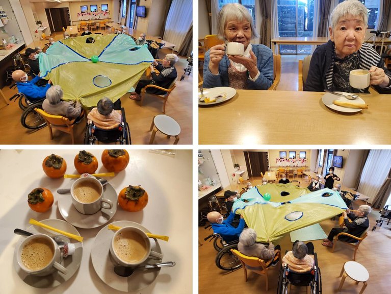 本日も多くの利用者様にご参加頂き、当施設で人気の「穴に落とさないで⚾ゲーム」を行いました。単純なルールで、大勢で遊べて白熱し和気に楽しめます。穴に落ちると「あぁ落ちた…残念!」と発しながら直ぐシートの下に潜りボール⚾を拾って下さいます。30分しっかり楽しみ運動した後は、お好きな珈琲☕を注文され和やかな😋おやつ時間でした。