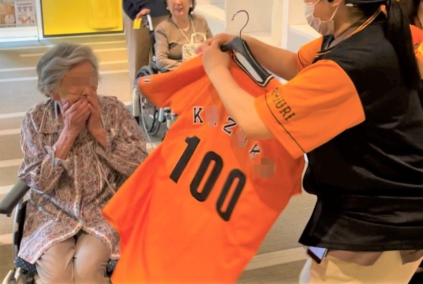 大大大の巨人ファンのこの方に、ご年齢と同じ背番号100をあしらったジャイアンツカラーのユニフォームをプレゼントいたしました。