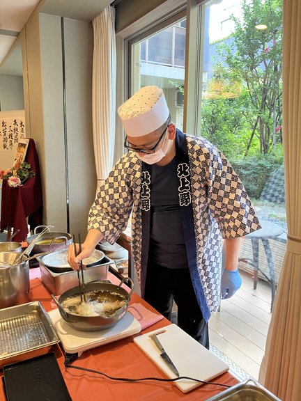 今回の天婦羅バイキングのメニューは、舞茸、茄子、ししとうの3種盛り合わせと松茸ご飯、小鉢、お吸い物、シャインマスカットをご提供させていただきました。おかわりで海老と南瓜もご用意し、「海老の天婦羅を3本もらおうかな。」と大好きな海老とノンアルコールビールを召し上がる方々もいらっしゃいました。「揚げたての海老がとても美味しかったです。」「美味しかった!」「次回ももちろん開催して欲しい。」と、皆様に秋の味覚を堪能していただけました。