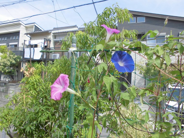 入居者様が丹精込めて育てたアサガオ。つるを170cm程まで伸ばし、つぼみが次々に膨らんでいます。毎日朝になると薄紫色や青色の花が綺麗に咲いています。