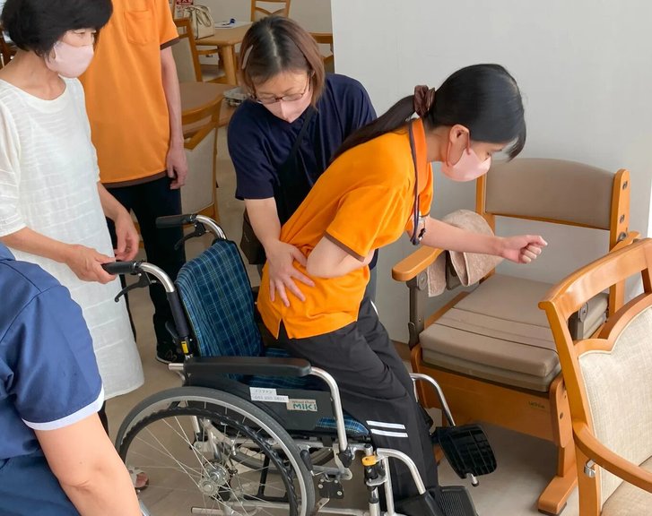 事例に対して自立支援やボディメカニクス、プライバシー保護を皆で確認しながら実技を行いました。本部で受講した内容をスーパーバイザーがアドバイスしてくださり、とても充実した研修になりました。