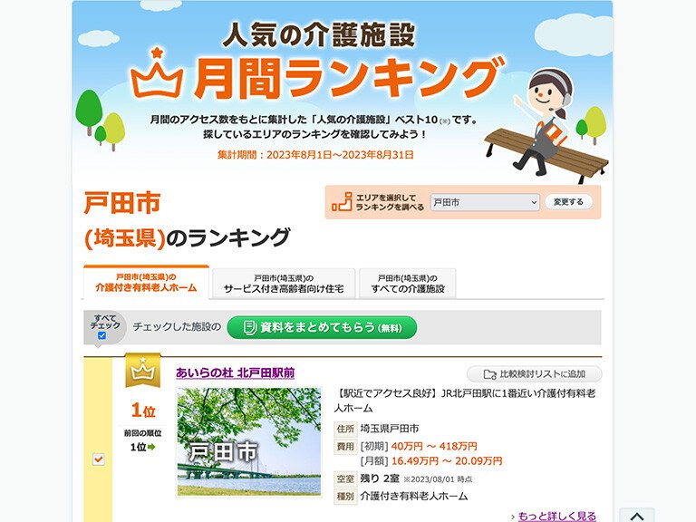 戸田市介護付有料老人ホーム人気ランキングで8ヶ月連続1位に選出されました(LIFULL介護2023年2-9月)