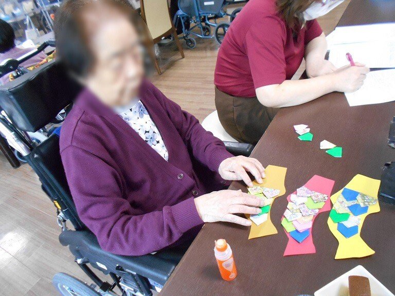 鯉のぼりの壁画を作成しました。真剣な表情です。