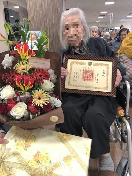 3月のお誕生会では95歳を迎えられたご入居者様に長寿のお祝いの賞状をお花をお贈りさせていただきました。
