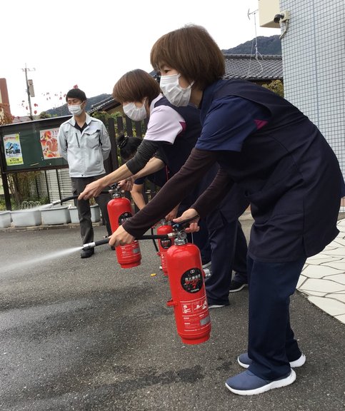 実際に通報、避難誘導、消火訓練を行い、各自の役割などを再確認しました。