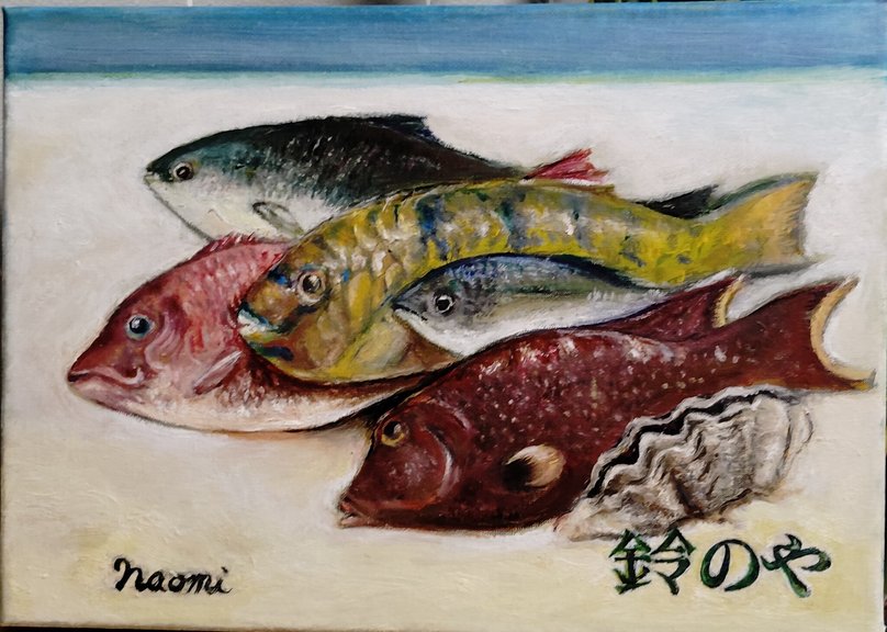とても絵がお上手な方で、お食事処の店主の方から、お店で提供している魚の絵をかいて欲しいと頼まれて描いたそうです。