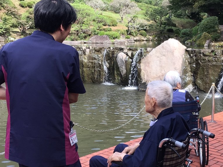 慧洲園では、滝の音と紅葉の色づきが美しく、皆さま口を揃えて「滝がきれいだったね」「空気が気持ちよかった」と穏やかな笑顔で話されていました。