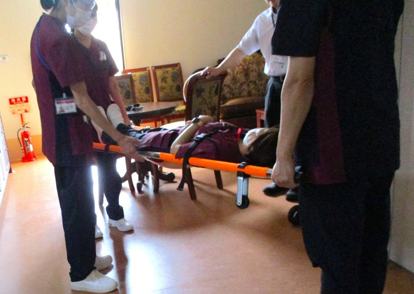 職員は交代で担架を持ち、居室から安全な場所まで慎重に移動。「思ったより重いね」「移動のときは息を合わせないと危ないね」など、現場ならではの気づきが次々とあがりました。