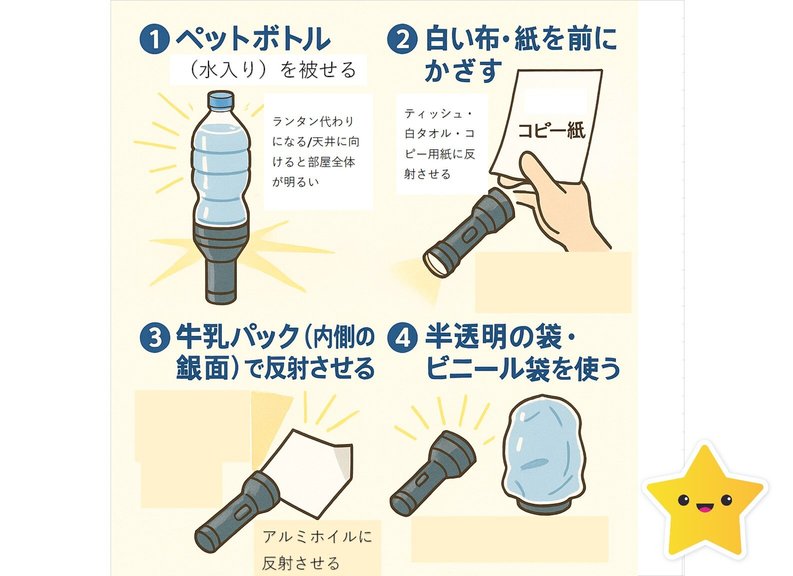 ペットボトルに水を入れてランタン代わりに、白い紙を当てて光を柔らかくする、アルミで光を反射し手元を明るくするなど「最小限の道具でも“安心できる明るさ”を作れる」