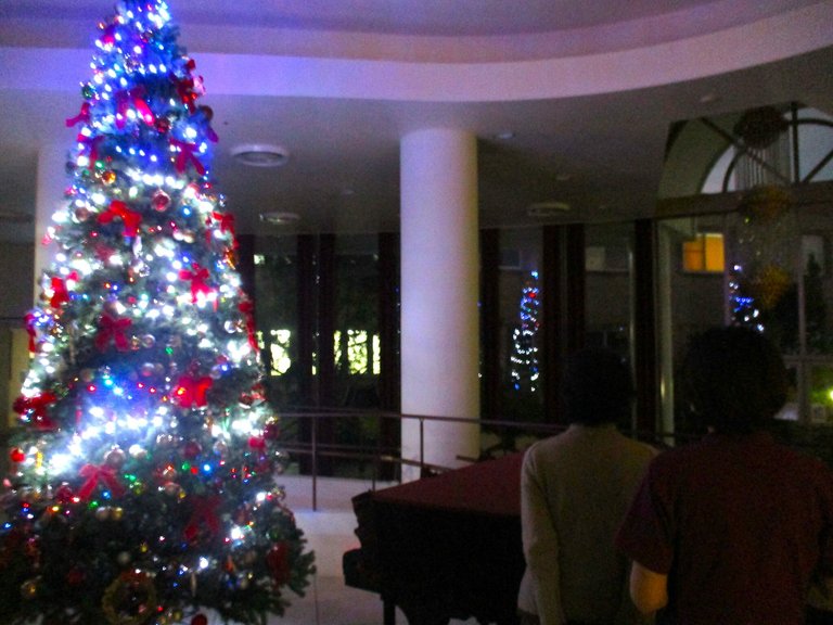 暗くなると、ティーラウンジの大きな窓ガラスにライトアップされたクリスマスツリーの光が反射し、まるで三つのツリーに囲まれているような幻想的な空間が広がります。