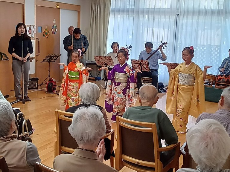 三味線、尺八、篠笛、太鼓等の楽器に合わせて『花笠音頭』『炭坑節』『東京音頭』『花が咲く』を入居者の皆さんも一緒に歌いました。