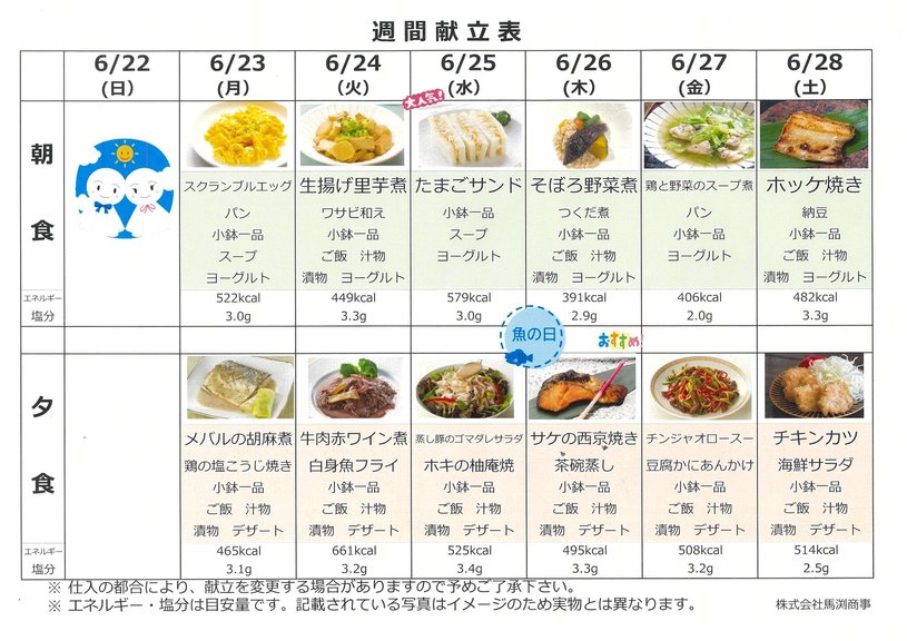 画像はちょうど今週一週間でご提供したお食事メニューです。