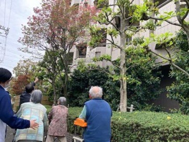 数人で窓の外を見ておられました。ピンクのハナミズキが見え