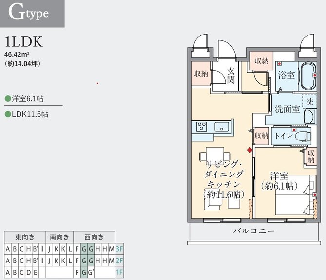 11.6帖LDKに6.1帖洋室の使いやすい振り分けタイプです。