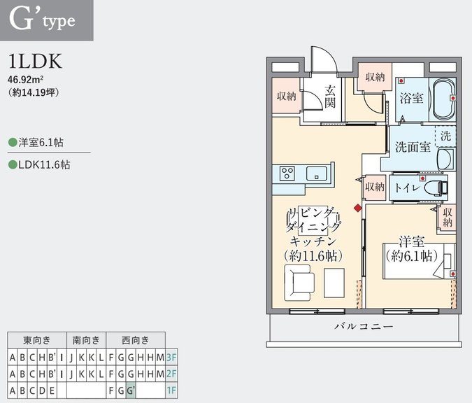 1LDK:46㎡:西向きです。
