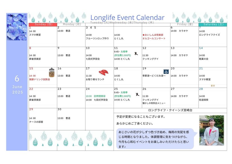 あじさいが静かに色づき始め、梅雨の気配が感じられるようになりました。ロングライフ・クイーンズ宮崎台では、雨の日も心が晴れやかになるような、季節感あふれるイベントを多数ご用意いたしました。