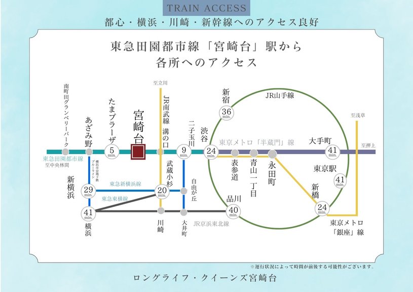 ロングライフ・クイーンズ宮崎台にお住まいのお客様の中には、二子玉川や横浜、表参道に銀座などへのお出かけを楽しまれたり、お仕事へ通われている方もいらっしゃいます。