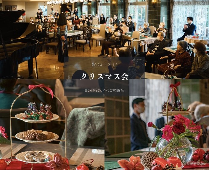 12月13日、「ロングライフ・クイーンズ宮崎台」にてクリスマス会が開催されました。会場にはクリスマスの華やかな雰囲気が広がり、お客様も自然と笑顔に。