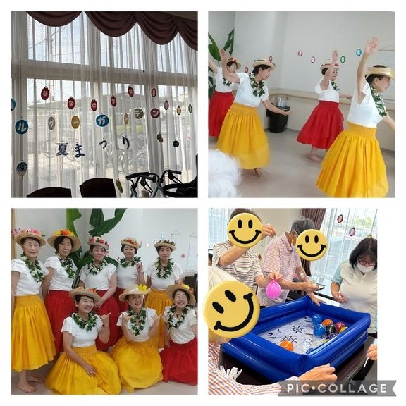 今年の夏祭りは、水ヨーヨー・射的・輪投げ・お菓子のつかみ取り・ボランティア様によるフラダンスのお披露目もあり、楽しくゆったりとした時間を過ごすことが出来ました。