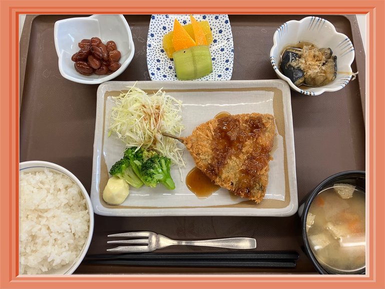 ・アジフライ・茄子の煮びたし・ご飯・煮豆・豚汁・フルーツ