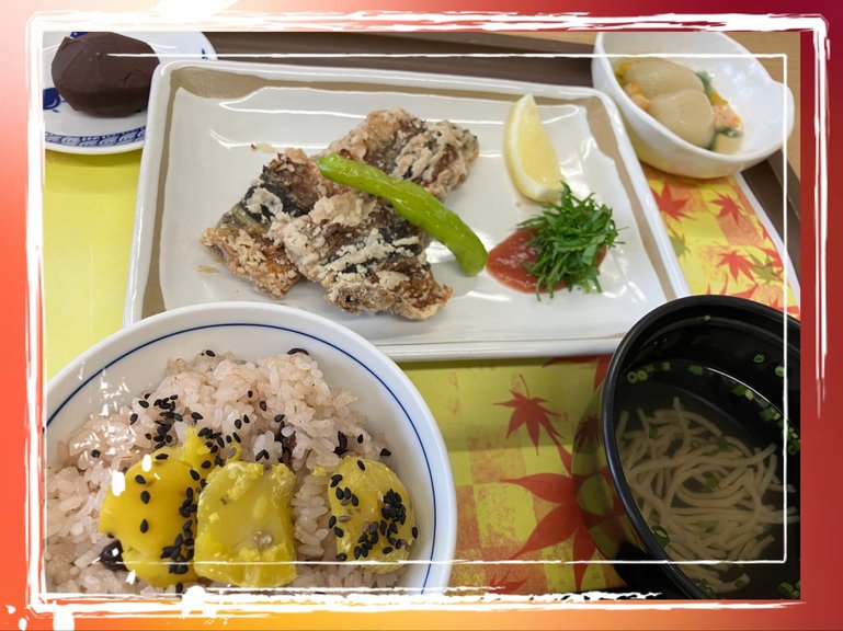 ・栗赤飯・すまし汁・さんまの梅竜田揚げ・かぶの菊花あん・薩摩芋おはぎ