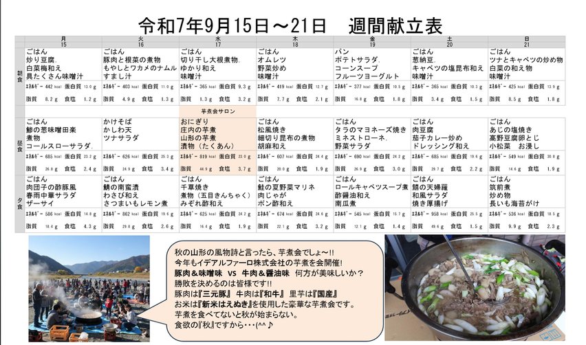 #芋煮会 #イデアルファーロ株式会社 #特定非営利活動法人あらた #未来食堂 #週間メニュー #山形県 #酒田市