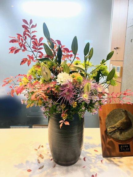フロント付き賃貸マンション未来創造館のフロントに今週も花を生けることができました。秋も深まりハラハラと葉の落ちる季節です。明日から酒田市も寒くなると報じられています。館内は温かいので安心です。新種の百合とのことですが開花が楽しみです。菊もさまざまで初めて会う種類の菊も生けました。花き農家さんありがとう。