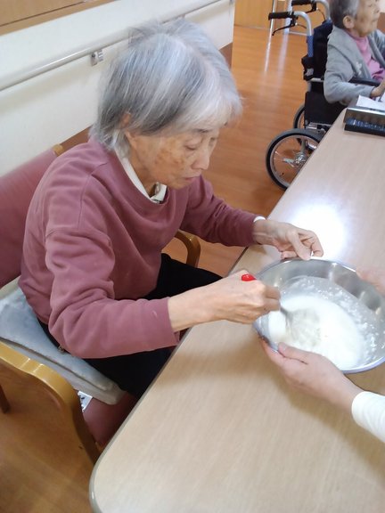 お誕生日会ではふわふわなホットケーキを作りました。みんなで順番に生地を混ぜケーキ職人のような手さばきを見せて下さいました(*^▽^*)