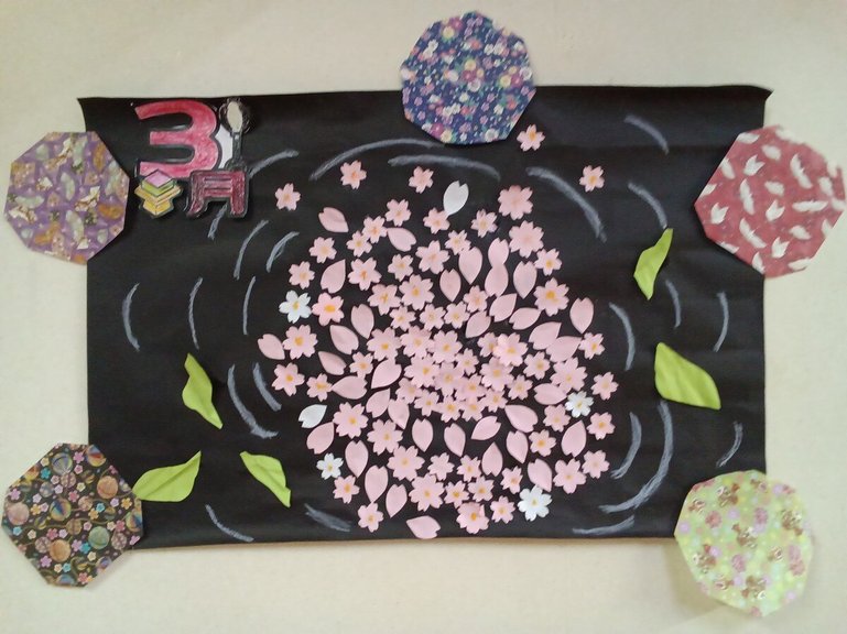 今回の3月の壁面です。模造紙に花びらを貼り、水面に花びらが浮かんでいる様子を作成してみました!