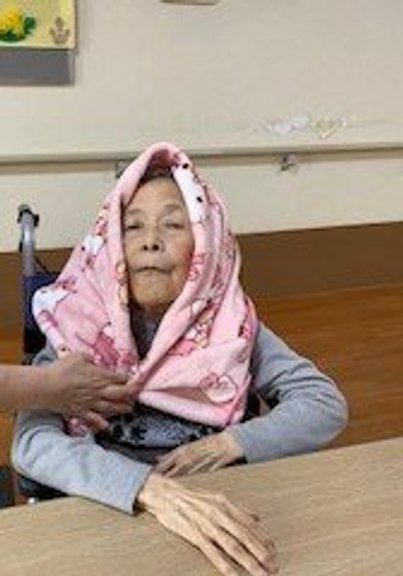 火事が起きた事を想定し、避難訓練を行います。頭を近くの人形で守ったりひざ掛けで頭を守り職員の「火事!!」のかけ声で素早くテーブルの下に避難する方も