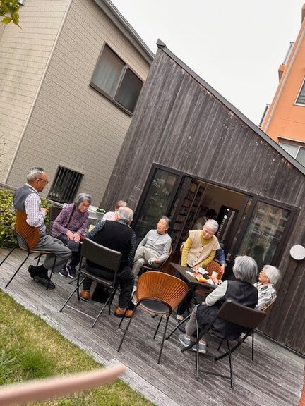 気候の良い季節になってきたので、入居者同士の集いの場として、図書室前テラスで、カフェを開催しました。