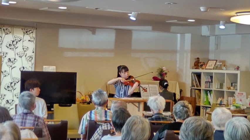 バイオリンとピアノの演奏から始まり、久石譲 千と千尋の神隠しで有名な歌「いつでも何度でも」バッハ「G線上のアリア」等美しいバイオリンとピアノ音色に包まれて入居者の皆さん思い思いに聴き入っていらっしゃいました。