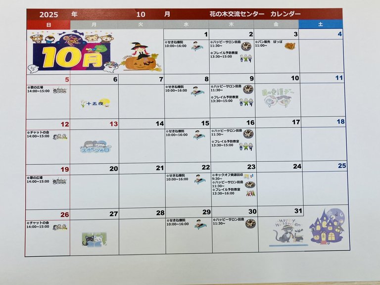 「ゆいま~る花の木」および「秩父市花の木交流センター」では居住者および地域の方向けに、2025年10月に以下のカレンダーのとおり、活動・催事を予定しています。