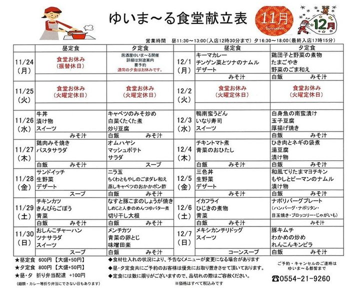 11/24~12/7の食堂献立表です【ゆいま~る都留】