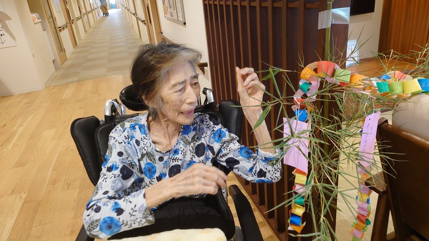 ホーム内の食堂に色とりどりの折り紙や短冊、笹の葉を用意し、笑顔あふれる時間となりました。