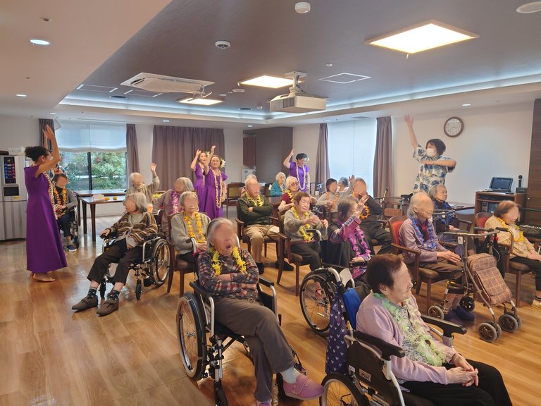 陽気なハワイ音楽に合わせて、波のように豊かに体を動かすフラダンスは、お客様の中でも昔から楽しまれていた方も多く、大盛り上がりとなりました。