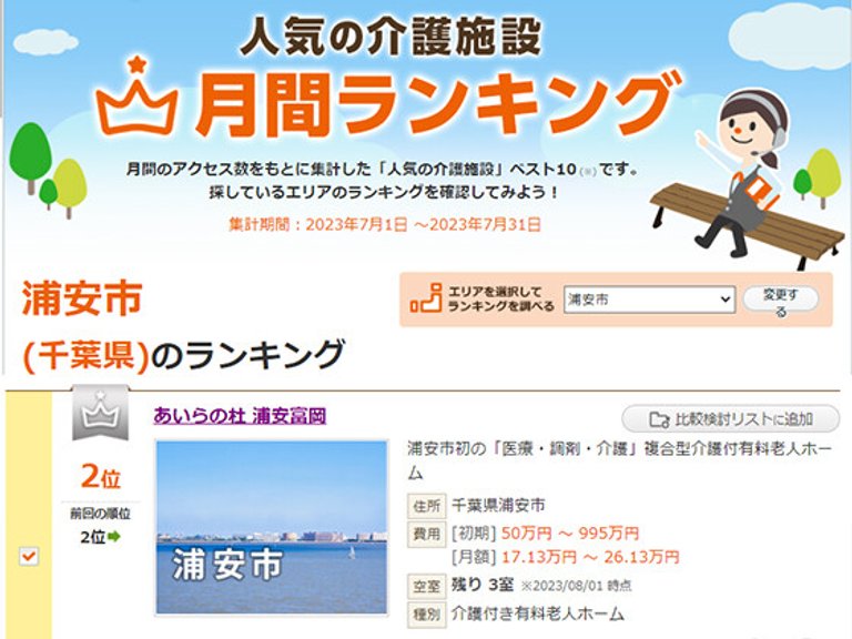 浦安市の介護付有料老人ホーム人気ランキングで2位に選出されました(LIFULL介護2023年8月)