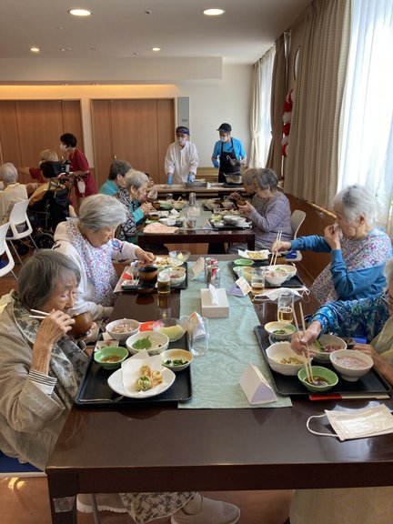 敬老会を開催しました。猛暑も続いておりますので、今回は施設内の企画中心で開催しました。昼食は「天ぷらライブキッチン」を開催。厨房から調理人も特設会場に出て、皆様の前で、天ぷらを調理、揚げたてを提供させて頂きました。皆様、沢山食べて、いつまでも変わらず笑顔でお過ごしください。