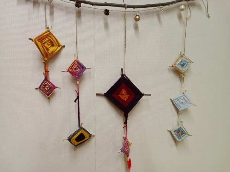 縁起のいいもの、とされているようです(^^)十字に組んだ木の枝に毛糸をぐるぐる巻きつけたものです。